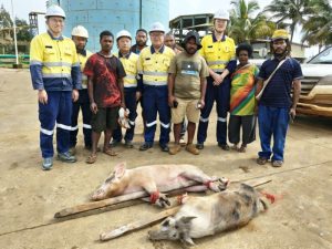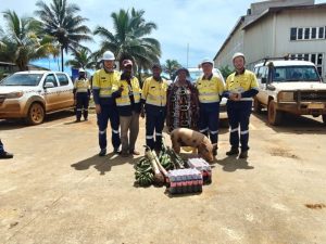 在巴新,猪有着极其特殊且重要的地位,绝非普通家畜可比。它是家庭财富的核心象征,代表着家庭的富足与安稳;是部落团结的精神纽带,维系着部落成员之间的紧密联系;更是迎接尊贵客人、庆贺重大节日时不可或缺的“礼仪之冠”。此次新春佳节,这份深厚的文化传统在瑞木与当地社区的互动中得到了鲜活体现。Pagazi Gavu部落代表满怀诚意,特意向公司赠送两头生猪,象征着丰收与富足,希望公司在新的一年里事业蒸蒸日上,收获满满;Guiging营地服务公司送上三头生猪,表达对公司的敬意与感激,感谢公司一直以来的支持与合作;Yori土地主公司更是精心筹备,除了送上猪之外,还准备了其他饱含心意的慰问品作为新年年礼。这些珍贵的礼物,承载着当地部落和土地主公司对中冶瑞木的真挚情谊与美好祝愿,是社企之间深厚情谊的生动见证。