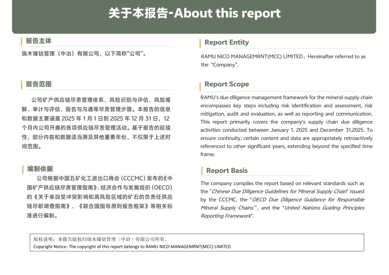 瑞木镍钴管理(中冶)有限公司(以下简称“公司”)认识到在“受冲突影响和高风险区域”从事矿产资源开采、交易、加工、出口存在可能造成不利影响的风险,并认识到我们有尊重人权、不助长冲突和不对环境和社会产生不利影响的义务,我们承诺采纳并广泛传播《中国矿产供应链尽责管理指南》(第二版)、《经济合作与发展组织关于来自受冲突影响和高风险区域的矿石的负责任供应链尽职调查指南》(第三版)相关内容,并将其纳入到与供应商签订的合同和协议之中。