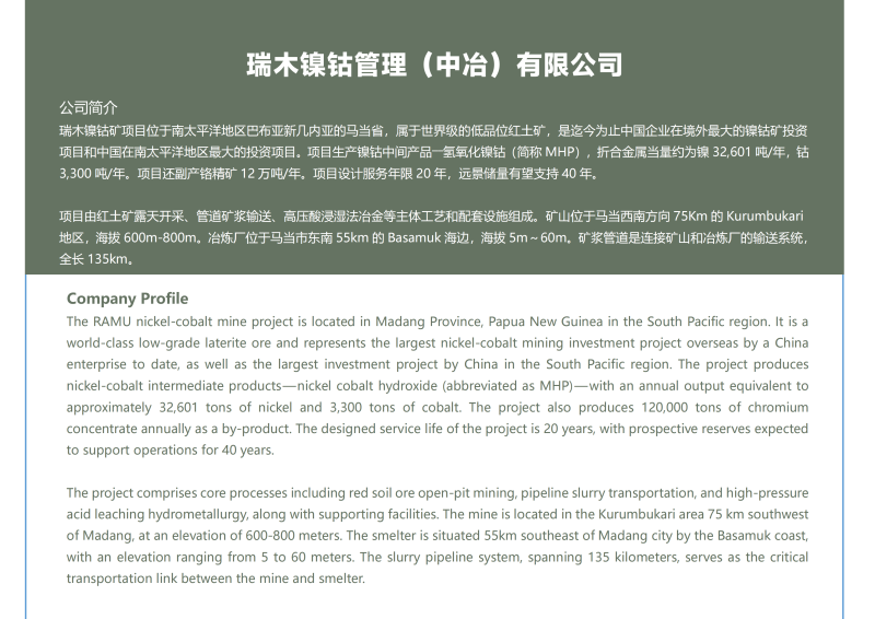 瑞木镍钴管理(中冶)有限公司,瑞木镍钴管理(中冶)有限公司秉承“成为世界一流、行业领先的国际矿业公司”的愿景,恪守“创造品质价值、践行责任担当、服务产业发展”的使命。作为国际矿业发展的践行者,我们承诺构建负责任、可持续的矿产供应链。
