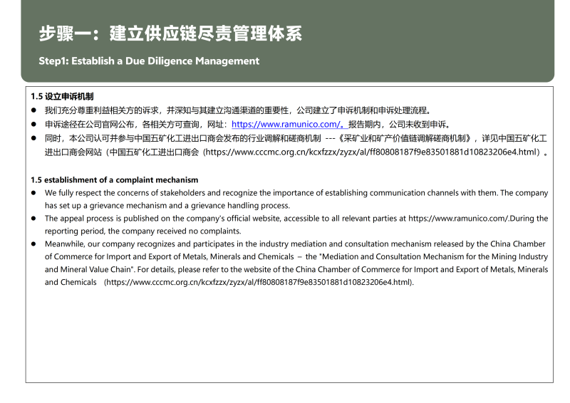 At the same time, the company recognizes and participates in the mediation and consultation mechanism issued by China Minmetals Chemical Import & Export Chamber of Commerce-Mediation and Consultation Mechanism for the Mining Industry and Mineral Value Chain. For details, please visit the website of China Chamber of Commerce of Metals, Minerals & Chemicals Importers and Exporters (https://www.cccmc.org.cn/).