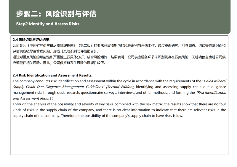 Depending on the specific position of the company in the supply chain, we commit to cooperating with suppliers, central or local government agencies, international organizations, civil society, and affected third parties as appropriate, with the aim of taking significant measures within a reasonable timeframe to prevent or mitigate risks of negative impacts, and to improve or track performance. If risk mitigation measures do not work, we will temporarily suspend or terminate cooperation with upstream suppliers. We will conduct additional risk assessment for the risks that need to be reduced after implementing the risk management plan. If the risk management plan does not show significant results within six months, and risks such as bribery, fraudulently misrepresenting mineral-producing areas, money laundering, and failure to control or reduce risks related to paying taxes, fees, royalties to the government persist, we will temporarily suspend or terminate cooperation with the supplier for at least three months. During the temporary suspension of cooperation, the risk management plan will be revised to clarify the performance targets that must be achieved before trade relations can be restored.